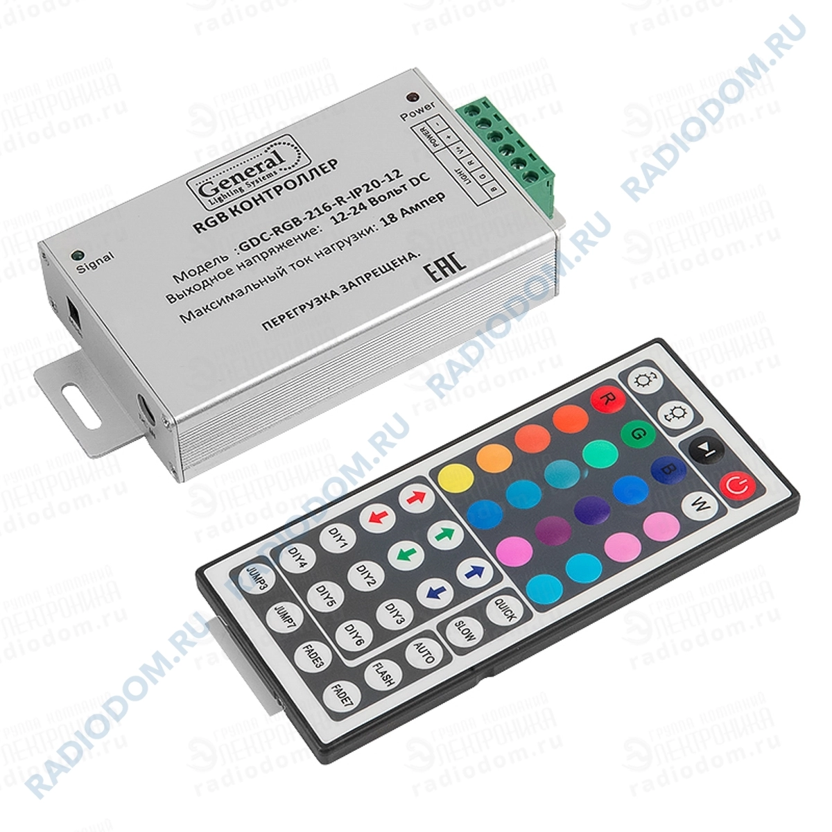 Контроллер c мощностью 216 Ватт подходит для упраления RGB лентами 12 Вольт и 24 Вольт, с возможностью подключения до 15 метров ленты. Поставляется в комплекте с радиопультом (44 клавиши), который позволяет выбрать оптимальный оттенок свечения и оптимальную программу смены цветов. Радиус действия до 30 м. Технические характеристики: Тип: Контроллер Назначение: для ленты RGB.