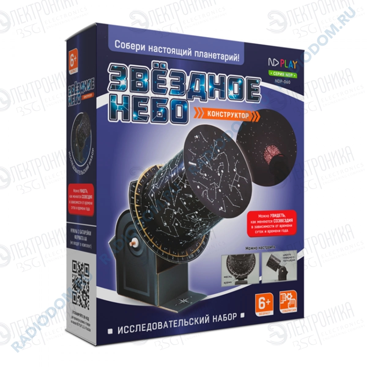 Исследовательский набор «Звездное небо» - это проектор собранный своими руками. Благодаря возможности настройки широты вы сможете наблюдать за различными созвездиями. Набор познакомит ребенка с основами астрономии. Самостоятельная сборка пойдет на пользу для мелкой моторики, развития фантазии, мышления и интеллекта. Питание от 3 батареек типоразмера АА. Исследовательский набор будет отличным подарком детям от 6 лет.