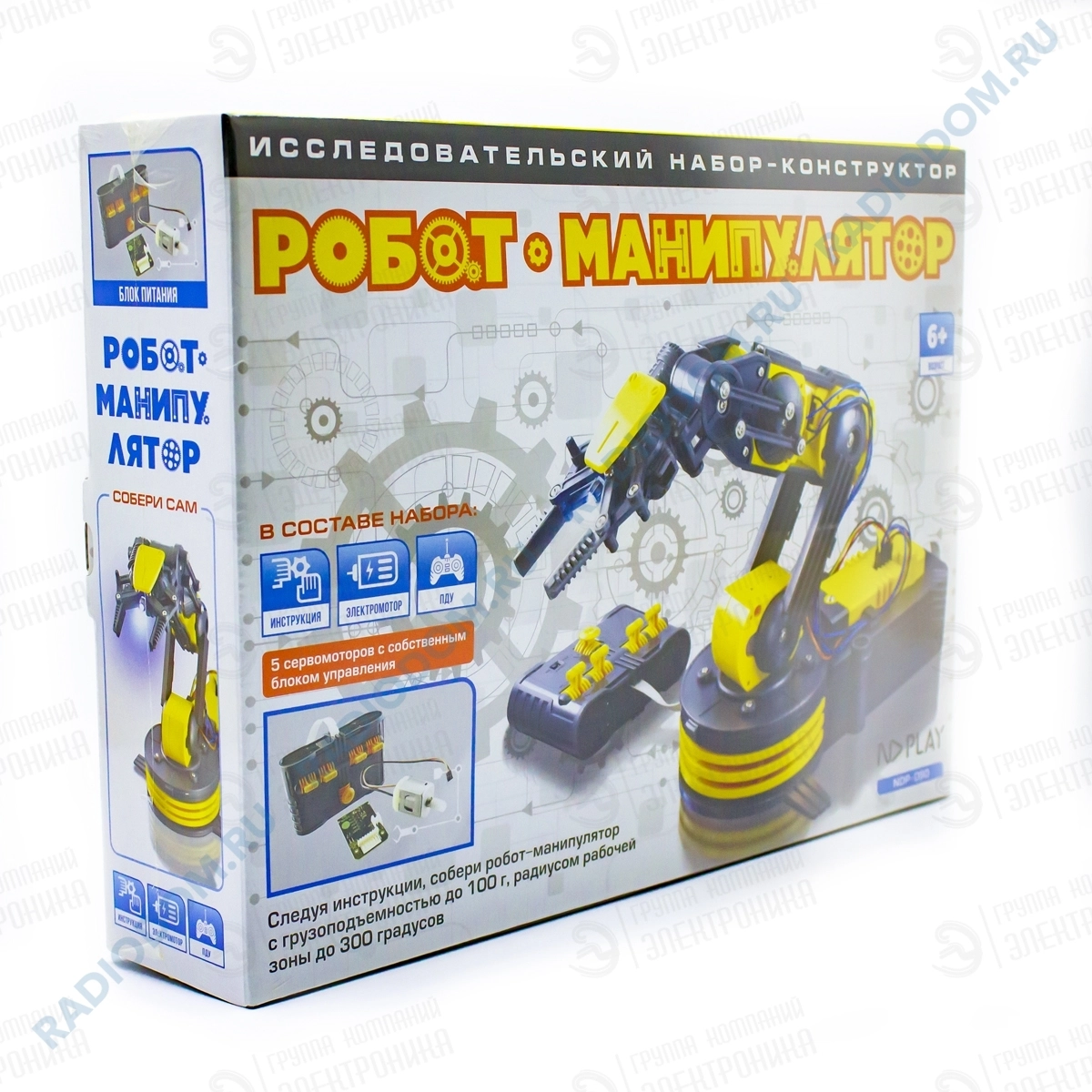 Электронный конструктор «Робот – манипулятор» позволяет собрать манипулятор (третью руку) на пульте управления, который также собирается самостоятельно. Манипуляторы все чаще встречаются в повседневной жизни. Они способны облегчить выполнение различных производственных работ. С помощью данного набора будет проще объяснить принцип работы робота ребенку. Собранный манипулятор может поднять вес до 100 грамм и перемещать его в рабочей зоне до 300 градусов. Процесс сборки способствует развитию мелкой моторики, усидчивости и концентрации внимания. Питание готового робота от батареек типоразмера D (в комплект не входят). Самостоятельная сборка возможна с возраста 6 лет.