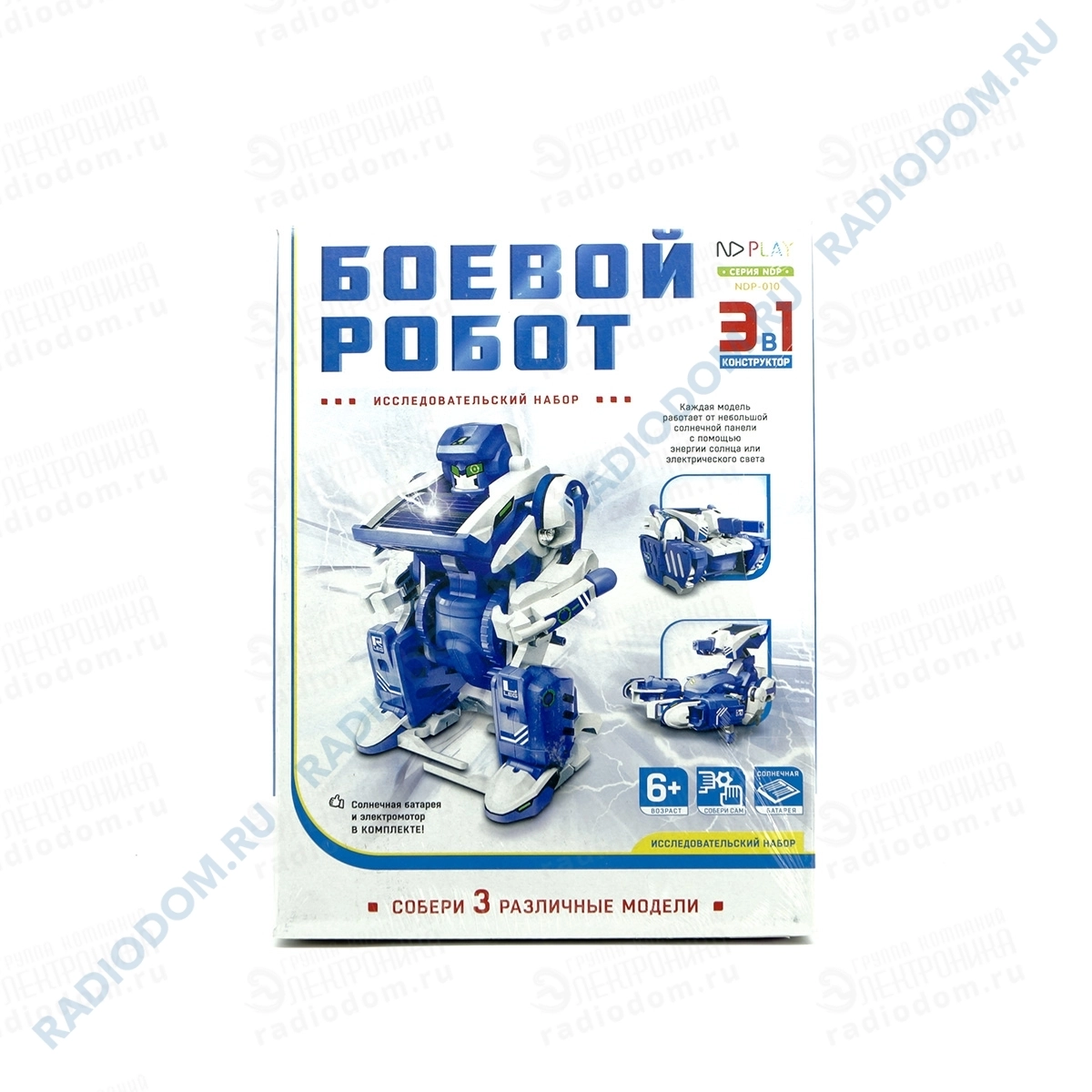 Электронный конструктор «Боевой робот» работает от солнечной батареи. Конструктор поможет рассказать ребенку про преобразование энергии солнца в механическую энергию. Набор подарит вашему ребенку огромное количество позитивных эмоций. Самостоятельная сборка пойдет на пользу для мелкой моторики, развития фантазии, мышления, интеллекта и познакомит с основами физики, моделирования и конструирования. Набор позволяет собрать 3 различных модели робота. Возрастное ограничение 6 лет.