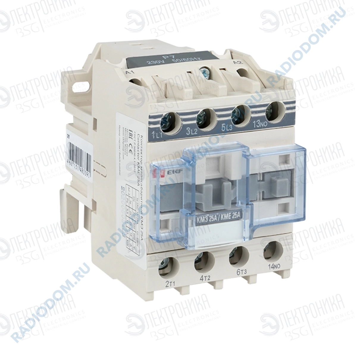 Контакторы КМЭ EKF PROxima состоят из корпуса, закрепленных в нем неподвижных контактов, подвижных контактов, которые закреплены в подвижной части магнитной системы. Неподвижная часть магнитной системы закреплена жестко в корпусе КМЭ. Пружина препятствует смыканию контактов. При подаче напряжения на катушку управления в магнитной системе контактора возникает магнитное поле, которое, преодолевая сопротивление пружины, смыкает магнитную систему и замыкает контакты. При отключении напряжения с катушки управления пружина размыкает контакты. Возможна коммутация алюминиевыми медным проводом.