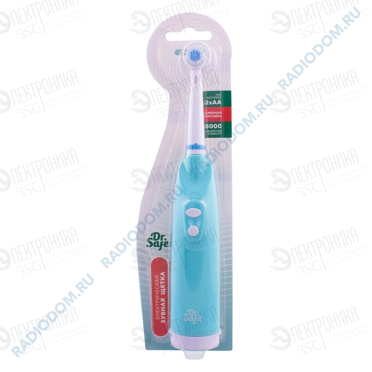 Электрическая звуковая зубная щетка DR.SAFE ЭЗЩ-2 СТАНД 5000. Зубная щетка DR Safe ЭЗЩ-2 — стандартная электрическая зубная щетка со сменной насадкой, ротационная. Производитель — известный бренд гигиенических товаров Dr Safe, страна производства - Китай. Инновационная технология ротационной чистки зубов позволяет деликатно и бережно очищать каждый участок ротовой полости, при этом быстро и эффективно. Такой метод чистки подходит людям с чувствительной эмалью зубов. Съемная закругленная головка щетки с мягкой щетиной Dupont Tynex совершает 5000 оборотов в минуту, под углом 60 градусов. Устройство работает от 2-х батареек АА. Корпус щетки из прочного пластика, рукоятка с выемкой сзади удобно ложится в руку. Выполнен в белом и голубом цветах. На корпусе находятся кнопки включения и выключения. Внизу корпуса расположена крышка батарейного отсека, которая легко открывается поворотом влево. Cменная головка закругленная, с двумя рядами щетинок. Перед началом работы необходимо установить батарейки в батарейный отсек