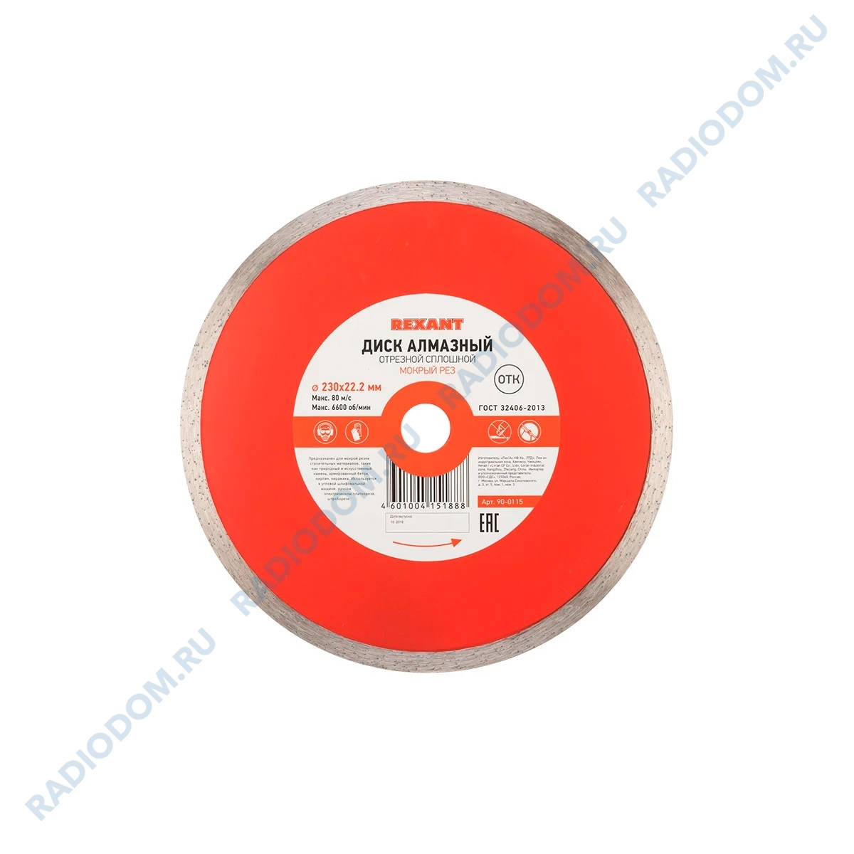 Диск алмазный отрезной сплошной 230x22.2 мм REXANT предназначен для мокрой резки строительных материалов, таких как природный и искусственный камень, армированный бетон, кирпич, керамика. Используется в угловой шлифовальной машине, ручном электрическом плиткорезе, штроборезе.
