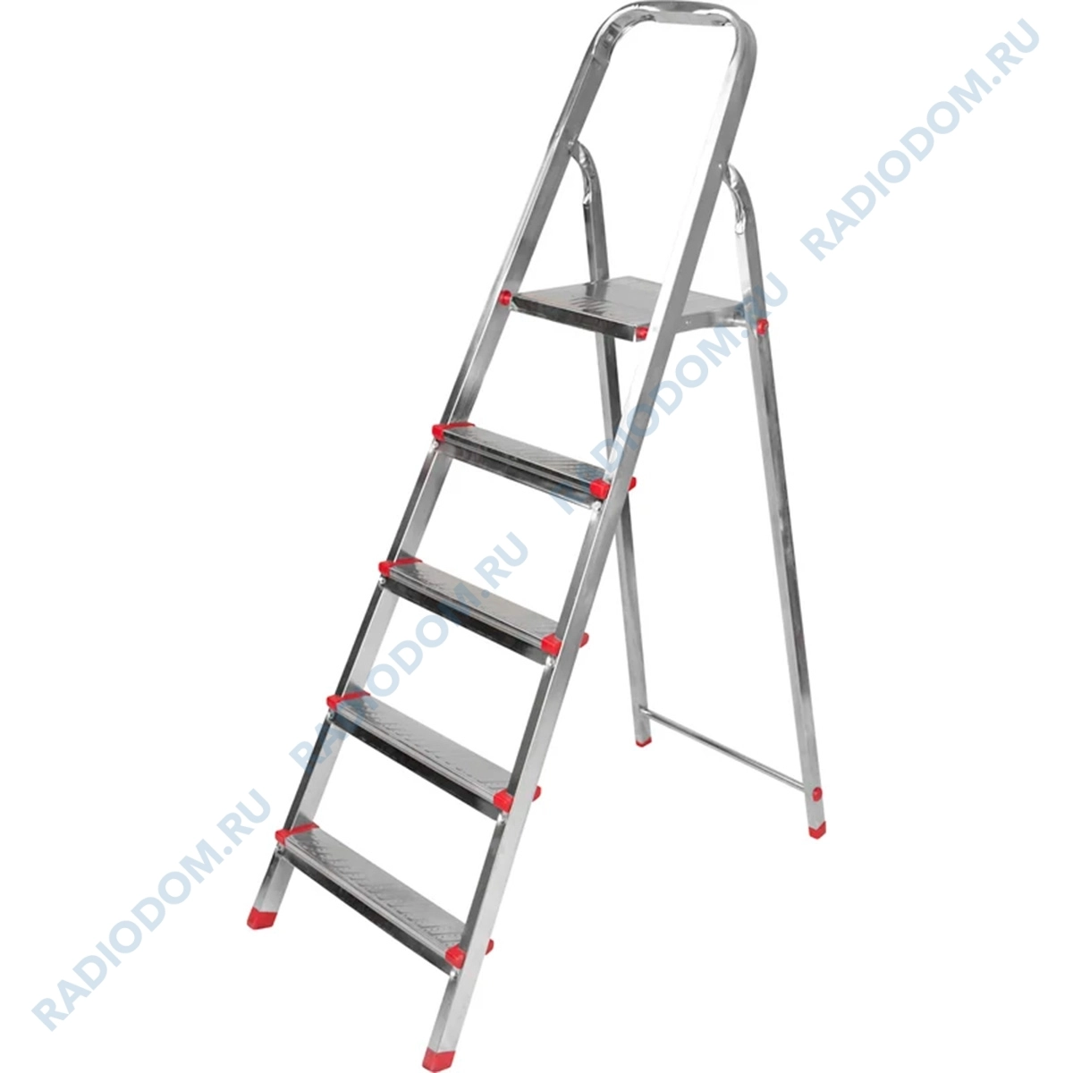 Стремянка металлическая состоит из 5 ступенек, применяется как в строительных целях, так и в быту, дома, на даче, в гараже и саду. Специальное соединительное ушко обеспечивает устойчивость конструкции и надежную фиксацию оборудования в рабочем положении. Ножки лестницы изготовлены в пластиковом покрытии; это предотвращает скольжение и защищает напольное покрытие от царапин, а упрочненное крепление ножек предотвращает их выпадение. Гальваническое покрытие гарантирует устойчивость к коррозии и защищает от негативного воздействия окружающей среды. Стремянка из усиленного профиля с 5 широкими ступенями с противоскользящим рифлением не занимает много места. Использование качественных материалов позволяет нагружать стремянку массой до 150 кг.