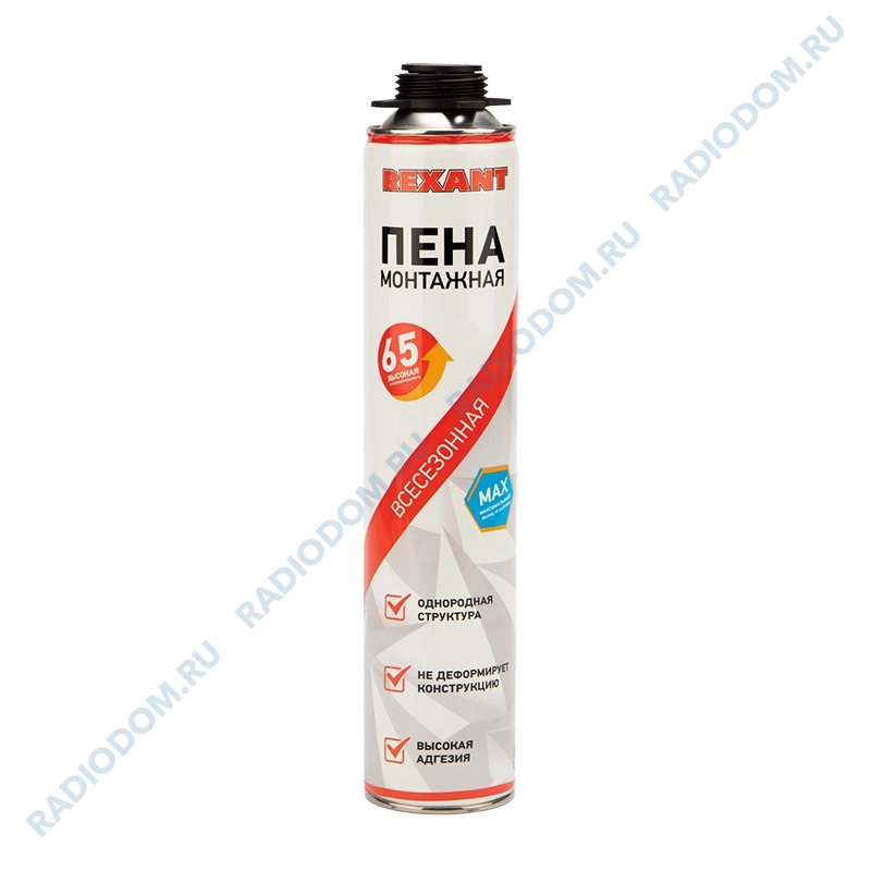 Однокомпонентная полиуретановая пена, расширяющаяся и застывающая под воздействием влаги, содержащейся в воздухе. Выход 65 л. Вес брутто: 780 г