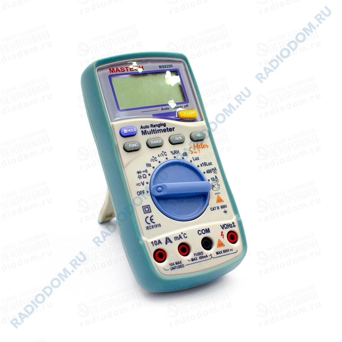 Прибор MS8209 позволяет измерять напряжение переменного, постоянного тока, сопротивление, частоту, относительную длительность импульса, ёмкость, осуществляют проверку диодов и прозвонку цепи.