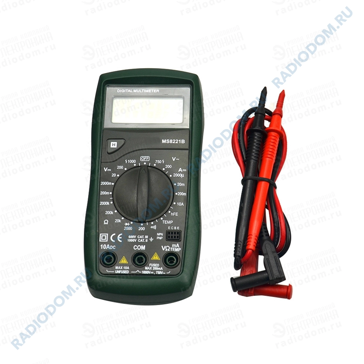 Данный цифровой измерительный прибор MS8221B позволяет производить измерения величин силы постоянного и переменного тока, постоянного и переменного напряжения, сопротивления и коэффициента усиления биполярных транзисторов. Так же мультиметр способен тестировать диоды и позванивать цепь. С помощью функции DATA HOLD можно зафиксировать полученные результаты. Все манипуляции и измерения проводятся с помощью удобных и качественных щупов.