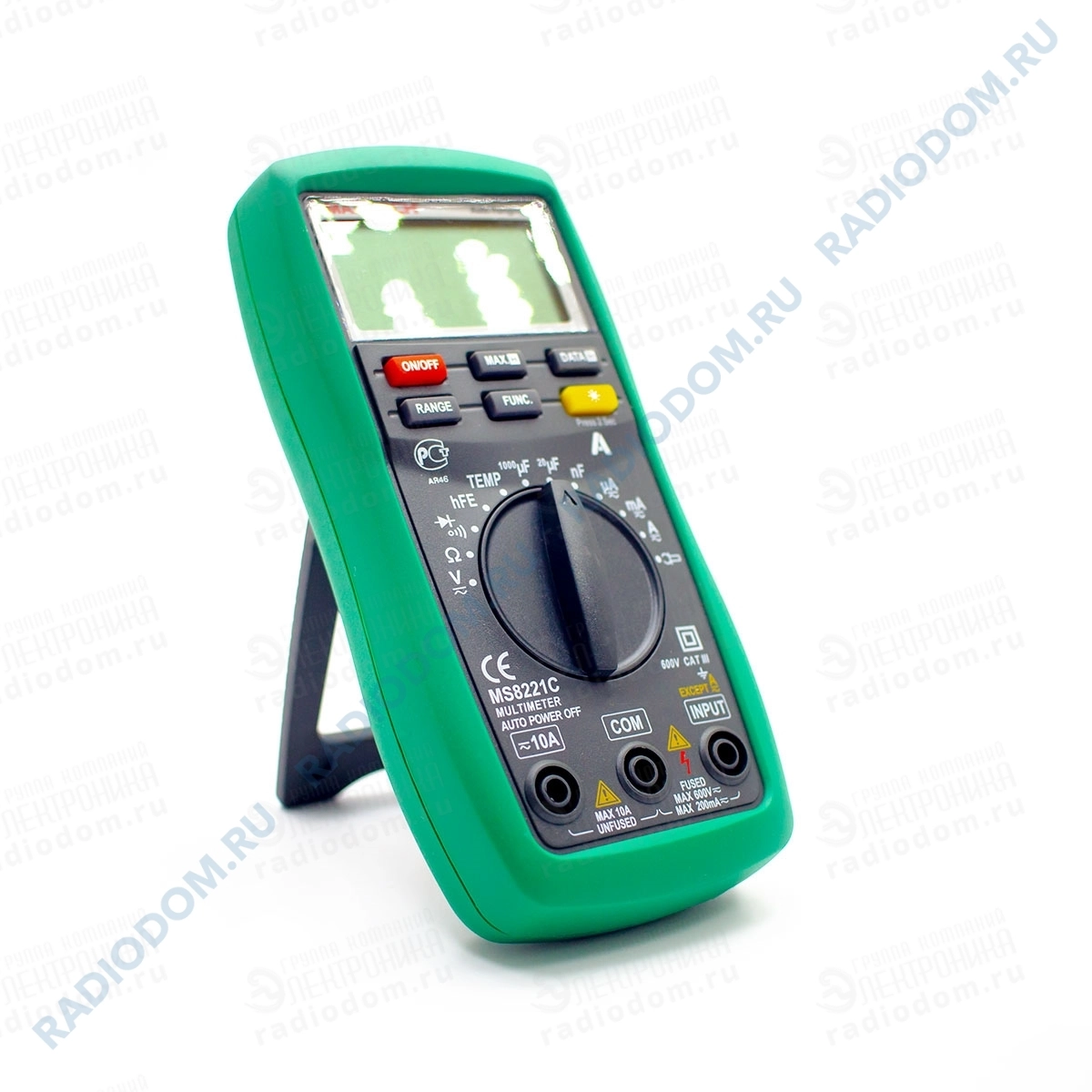 Данный прибор MS8221C позволяет измерять значения силы тока постоянного и переменного напряжения, сопротивления, ёмкости конденсаторов, температуры, тестирование диодов и осуществлять прозвонку целостности цепи. Функция автоматического отключения питания при долгом бездействии способна сохранять заряд батарей и обеспечивает дальнейшую работу прибора.