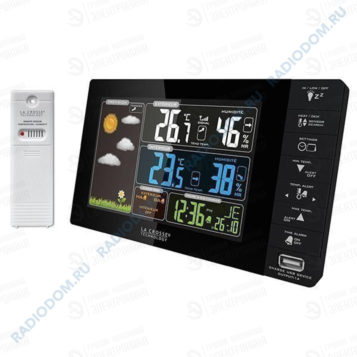 Домашняя метеостанция LaCrosse WS6827 - многофункциональное и очень информативное устройство для мониторинга метеоданных, отслеживания уровня комфорта в помещении, прогнозирования погоды. Большой основной блок с цветным дисплеем и внешний датчик температуры и влажности. Датчик беспроводной, связь с основным блоком через радиогинал на расстоянии до 90 метров. На дисплее отображаются температура и влажность внутри помещения и за его пределами. А также температура точки росы, индекс жары, время, дата, день недели. Данные обновляются каждые 50 секунд. Работает от сети или 3-х батареек ААА. Есть USB-вход, через который можно заряжать смартфон