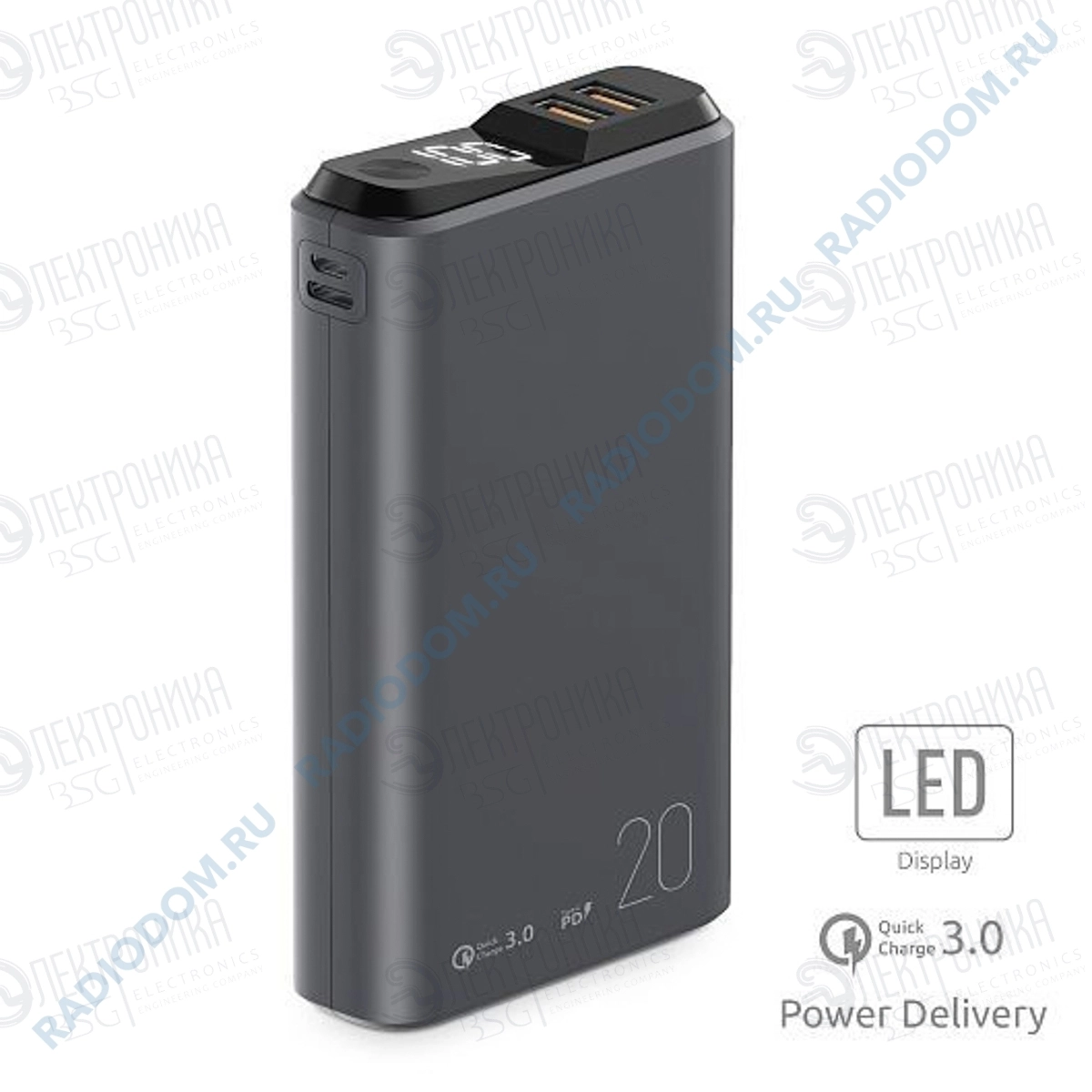 У повербанка QS-20 пластиковый корпус с бархатистым напылением софт-тач. Модель весит 350 грамм при емкости 20 000 мАч и работает на литий-полимерных элементах питания. На верхней части корпуса расположен яркий LED-экран, на котором в процентах отображается уровень заряда устройства.