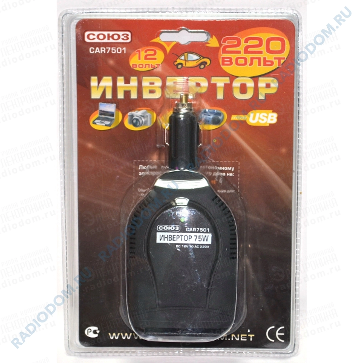Автомобильный преобразователь Союз CAR7501 используется для преобразования постоянного 12В в 220 переменного напряжения. Тип выходного напряжения – модифицированный синус. С помощью него вы сможете работать с разного рода повседневными электроприборами прямо в авто. Инвертор имеет защиту от короткого замыкания, перегрева, перегрузки. Максимальная мощность работы 75Вт. Работает от гнезда прикуривателя. Наличие USB – порта станет дополнительным плюсом. Встроенный предохранитель на 15А. Небольшие габариты позволят хранить его даже в бардачке автомобиля. Температурный диапазон использования устройства от -15˚С до +50˚С. Преобразователь оснащен функцией звукового оповещения при низком заряде аккумулятора автомобиля.