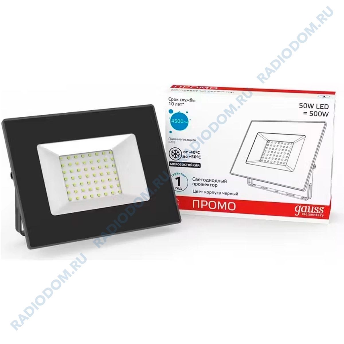 Благодаря металлическому корпусу и мощному радиатору прожектор не перегревается даже при длительной работе. Цветовая температура в 6500К – яркий белый холодный оттенок. Потребляемая мощность 50 Вт и световой поток 3510 Лм являются аналогом 500 Вт галогенового прожектора, что существенно сократит расходы на электроэнергию без потерь в качестве освещения. Степень защиты IP65 позволяет использовать прожектор на улице под навесом от прямых потоков воды. За счет надежного драйвера устойчив к скачкам напряжения, а также снижает негативное действие резких перепадов температур. Габариты 185х140х30 м40х30 мм.