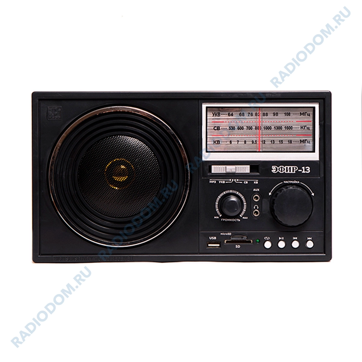 Эфир-13 имеет аналоговый тип тюнера, обеспечивает сигнал в диапазонах УКВ/СВ/КВ с частотой УКВ (64-108МГц) / СВ (530-1600КГц) / КВ (6,0-18,0МГц) соответственно, наличие 1-го динамика с мощностью Φ100mm/8Ω/8W. Радиоприемник работает как от сети 220V, так и от батареек R20 4 шт, размер изделия составляет 280х95х160мм, телескопическая антенна, имеется разъем под наушники, AUX, для блока питания 9В, USB, SD, microSD. Радиоприемник отличает панель воспроизведения MP3, универсальное питание.