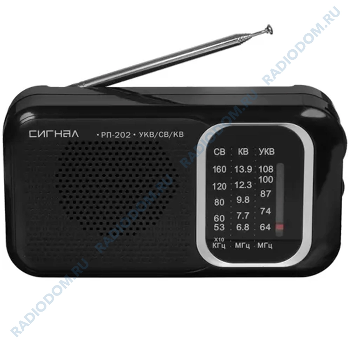 Выполнен он из пластика черного цвета, компактный размер 180х47х98мм, вес не более 400грамм. Радиоприемник имеет аналоговый тюнер, обеспечивает сигнал в УКВ/СВ/КВ диапазонах УКВ (64-108МГц) / СВ (530-1600КГц) / КВ (6,8-13,9МГц) соответственно. Преимуществом аналогового тюнера является возможность более точного поиска и настройки радиостанции. У РП-202 присутствует 1 динамик мощностью 0,5W, питание радиоприемника осуществляется от сети 220В или батареек R20*2шт. Также имеются следующие удобства для его эксплуатации: телескопическая антенна, разъем под наушники и ручка шнур для переноски.