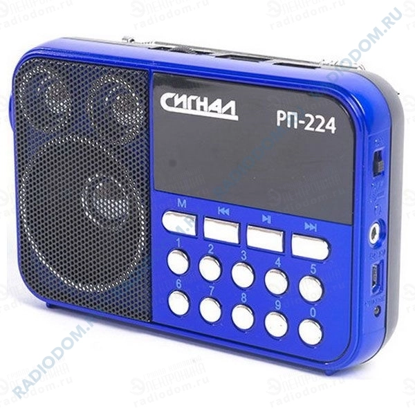 Радиоприемник имеет цифровой тюнер, обеспечивает сигнал в УКВ диапазоне с частотой 88-108МГц. Преимуществом цифрового тюнера является возможность автопоиска радиостанций. У РП-224 присутствует 1 динамик мощностью 3W, универсальное питание - от аккумулятора BL-5C ёмкостью 400мА/ч или от батареек AA*3шт. имеются следующие удобства для его эксплуатации: дисплей, телескопическая антенна, наличие слотов под USB, microSD карты, встроенный фонарь 0,5W, разъем под наушники и ручка шнур для переноски.