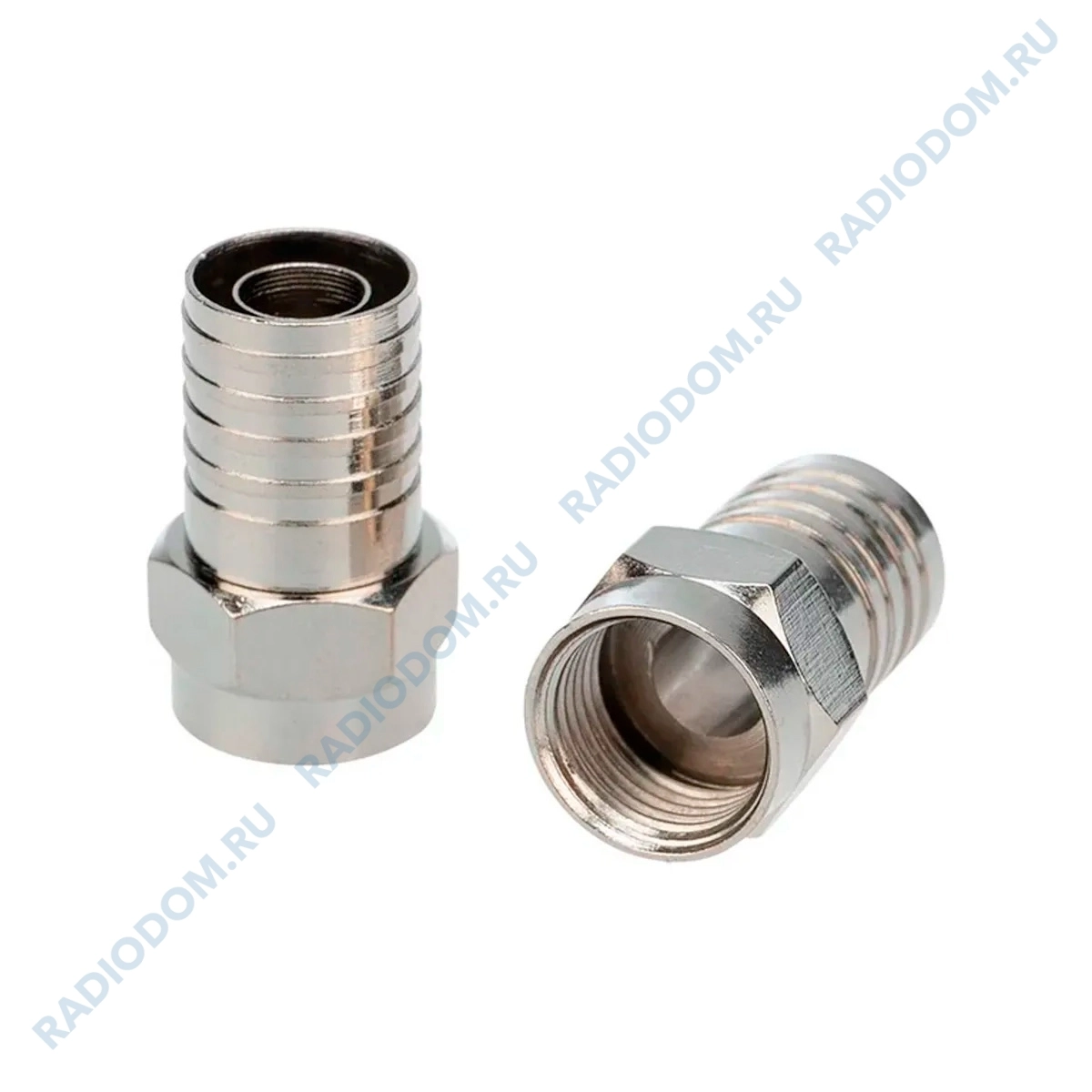 РАЗЪЕМ F-разъем RG-6 обжим REXANT предназначен для соединения коаксиального кабеля волновым сопротивлением 75 Ом с телевизионным и видеооборудованием (ресиверы, телевизоры, всевозможная видеоаппаратура и т.д.). F-коннектор изготовлен из никелированного сплава меди (биметалл). Разъем устанавливается на кабель обжатием после соответствующей зачистки контактов с помощью специального обжимного инструмента. При обжатии разъема втулка равномерно зажимает кабель по окружности. F-штекер выступает в роли своеобразного экрана за счет обжатия на оплетке кабеля для выполнения роли электрического контакта. Такой высокочастотный соединитель имеет ряд положительных преимуществ: