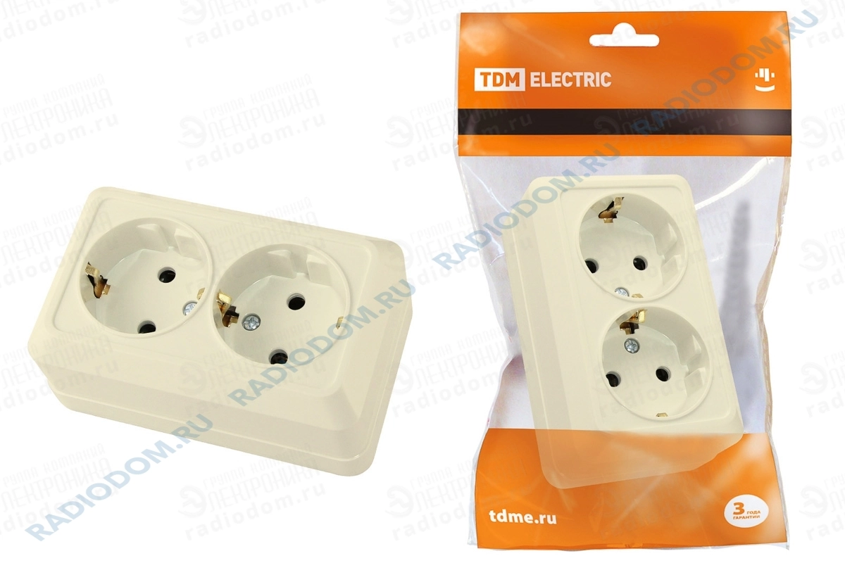 Сетевая розетка открытый монтаж сдвоенная с заземлением 2П+3 слоновая кость Ладога 16А IP20 TDM ELECTRIC SQ1801-0020