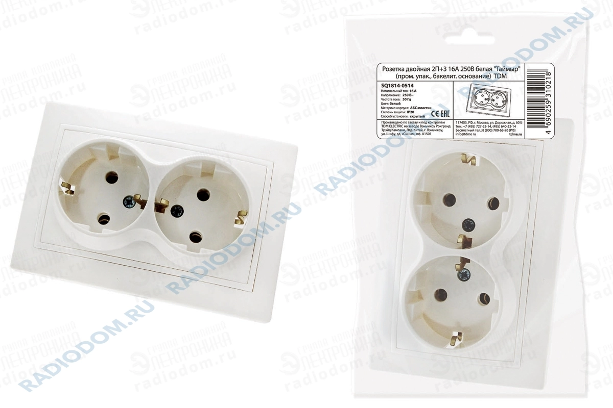 Розетка скрытая с заземлением двойная белая Таймыр TDM ELECTRIC