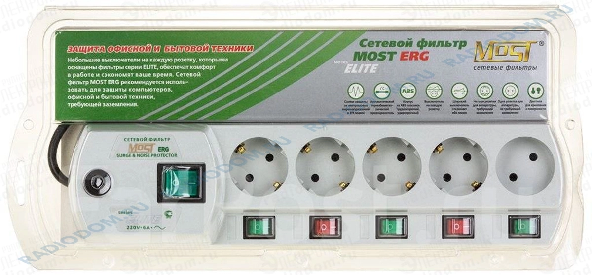 Сетевой фильтр 5 гнезд 2м белый ELITE ERG MOST