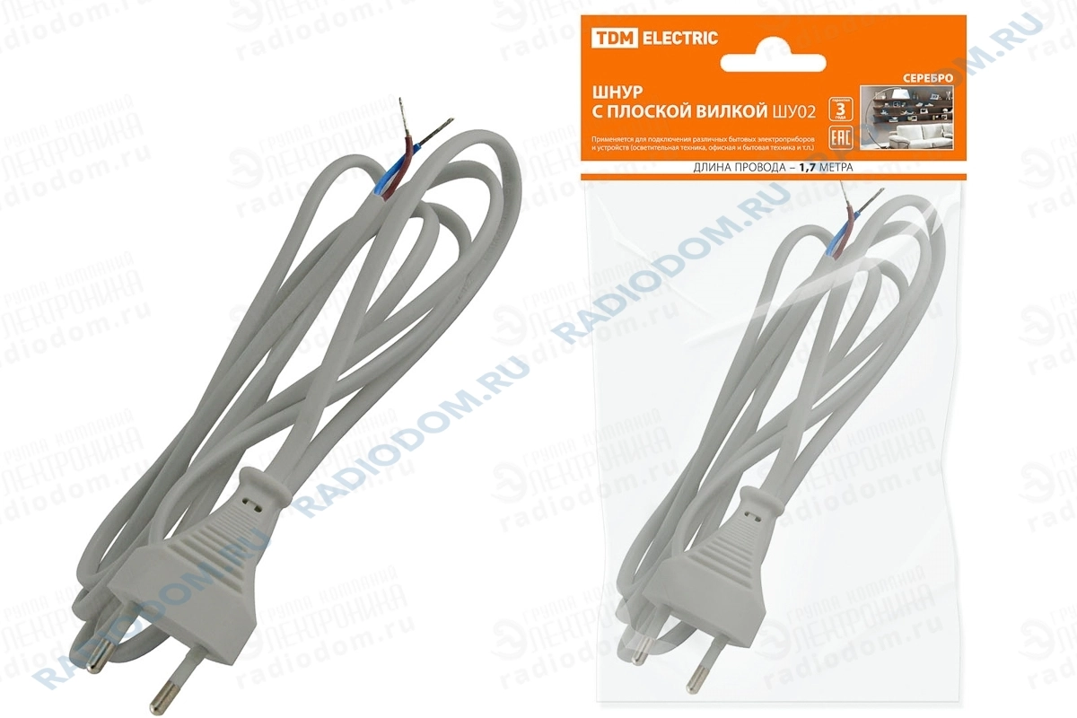 Кабель питания 2x0,75мм серебристый 1,7 м ШУ02 TDM ELECTRIC