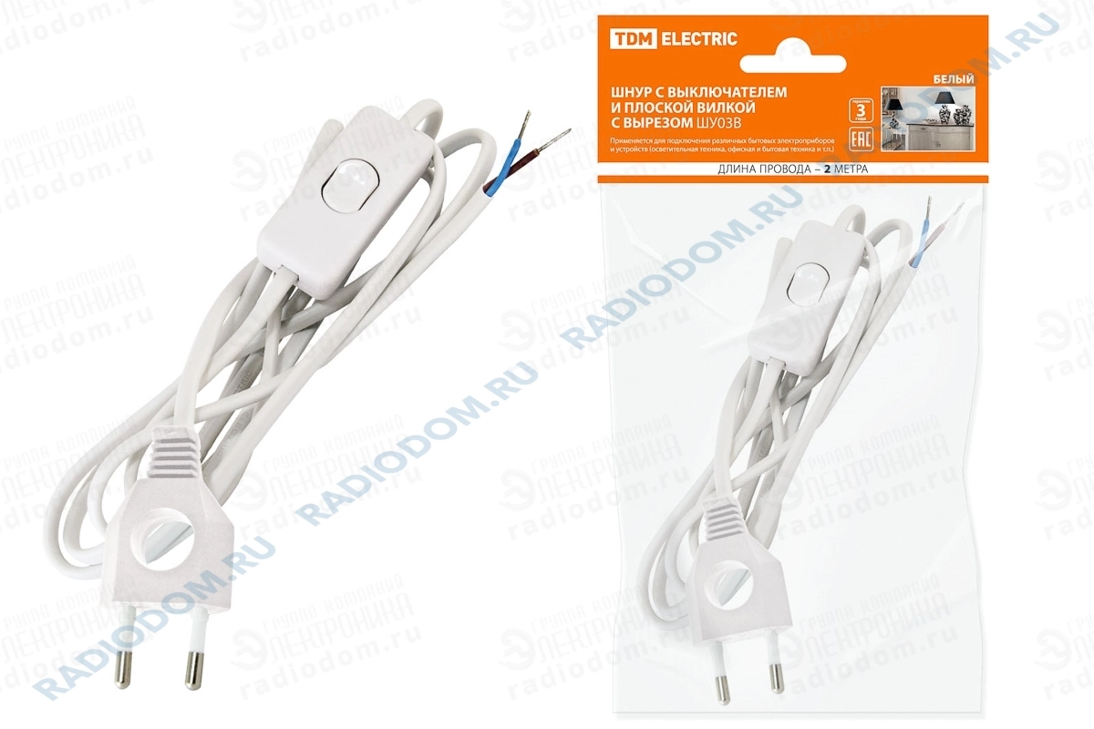 Кабель питания 2x0,75мм с выключателем белый 2,0 м ШУ03В TDM ELECTRIC