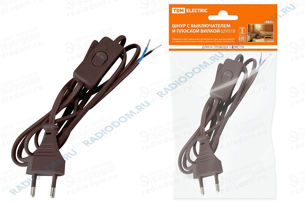 Кабель питания 2x0,75мм с выключателем коричневый 2,0 м "ЭКО" TDM ELECTRIC
