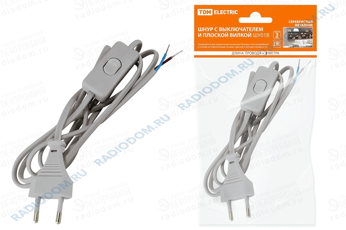 Кабель питания 2x0,75мм с выключателем серебристый 2,0 м ШУ01В TDM ELECTRIC