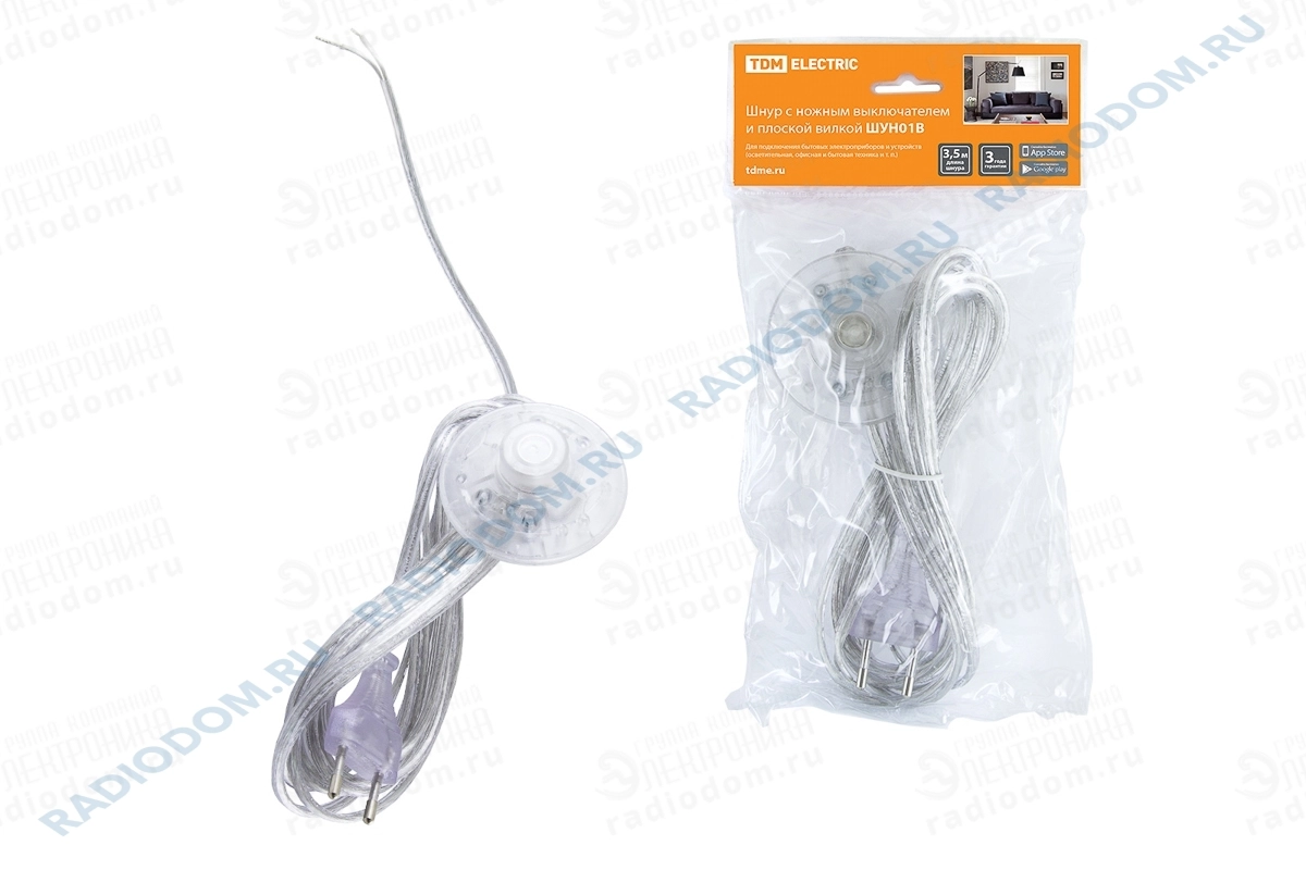 Кабель питания 2x0,75мм с ножным выключателем прозрачный 3,5 м ШУН01В TDM ELECTRIC