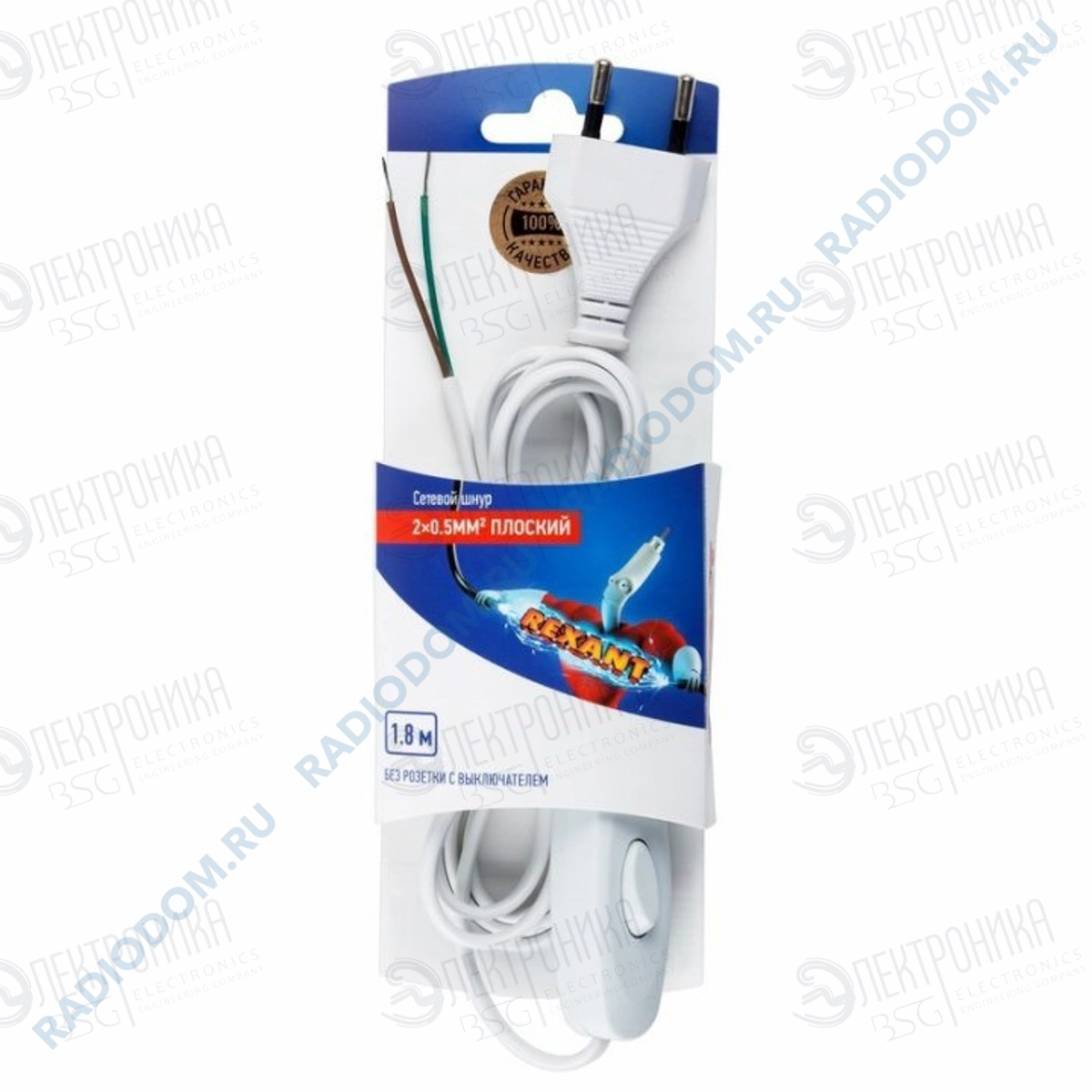 Шнур сетевой 1.8М с выключателем без розетки 2.5A-220V белый REXANT предназначен для подключения к сети переменного тока (AC) с напряжением 220B электроприборов напрямую (скруткой или клеммным соединителем), без использования розетки. Данный шнур состоит из двухжильного провода, с одной стороны литой неразборной плоской вилки (Евро), с другой подготовленных (зачищенных и облуженных оловом) проводников и расположенного посередине провода пластикового выключателя. Основные характеристики: