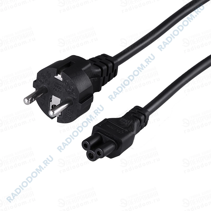 Шнур сетевой евро 3х0.75 мм² 1.8 м (PVC) (с заземлением) (ноутбук) REXANT предназначен для подключения к сети переменного тока (AC) с напряжением 220 B портативных компьютеров, ноутбуков, проекторов и других устройств, имеющих штыревой разъем типа C6. Данный шнур сетевой евро (IEC cord) оснащен с одной стороны неразборной литой вилкой (евростандарт) с заземляющим контактом, с другой — литым трехконтактным гнездовым разъемом типа C5 (в обиходе называют «Микки Маус» или «листом клевера») и трехжильным проводом с сечением жил 0.75 мм².