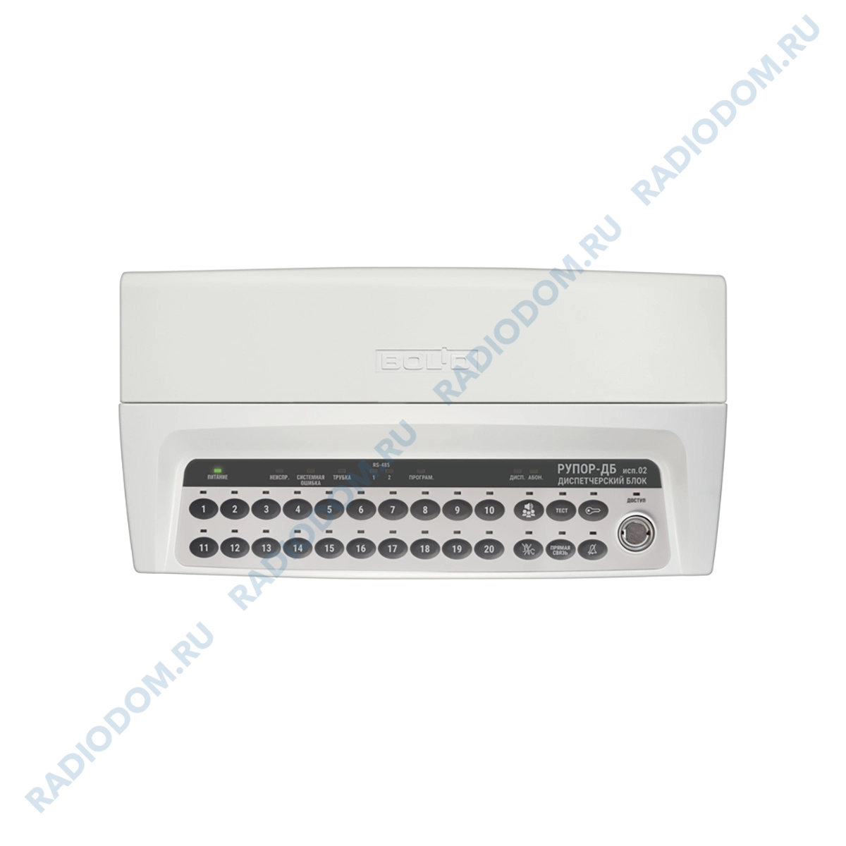 Блок «Рупор-ДБ исп.02» является частью адресного блочно-модульного прибора пожарного управления (ППУ) по ГОСТ 53325-2012 п.7.2.6 и предназначен для обеспечения двунаправленных каналов связи зон пожарного оповещения с помещением пожарного поста. В состав блочно-модульного ППУ, помимо диспетчерского блока, должен входить прибор приемно-контрольный и управления