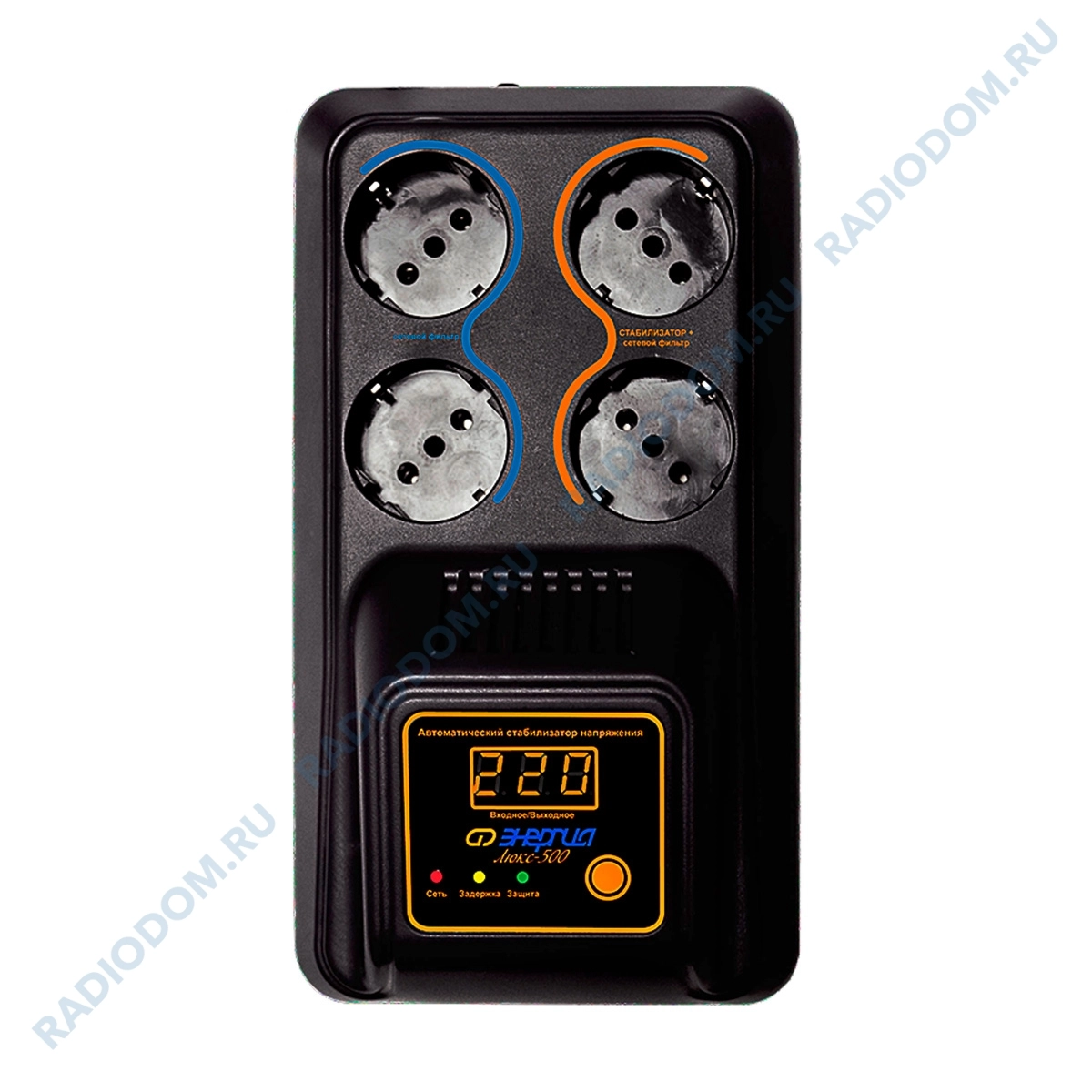 Стабилизаторы Энергия Люкс предназначен для защиты персональных компьютеров и другого оборудования небольшой мощности. Прибор прост в эксплуатации и оснащен четырьмя евророзетками, две из которых работают только в режиме «сетевой фильтр», а две другие – «стабилизатор + сетевой фильтр».