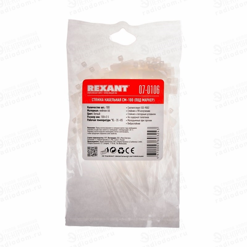Хомут кабельный 100x2,5мм белый упаковка 100шт под маркер Rexant