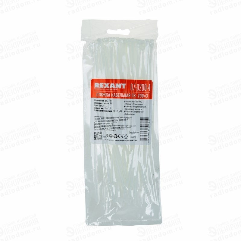 Хомут кабельный 200x2,5мм белый упаковка 100шт Rexant