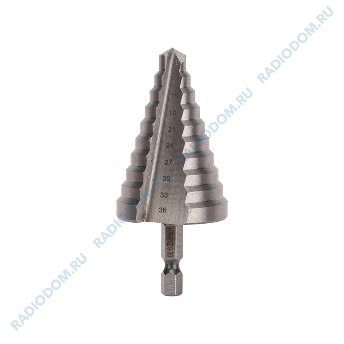 На каждой из 10 ступеней сверла нанесена маркировка фактического диаметра. Диапазон ступеней: 9, 12, 15, 18, 21, 24, 27, 30, 33, 36 (шаг 3 мм).