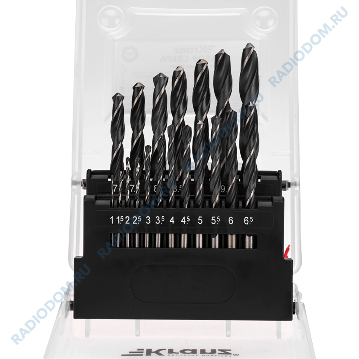 В состав набора входит 19 сверл, предназначенных для сверления отверстий в таких материалах, как сталь, дерево и пластик.