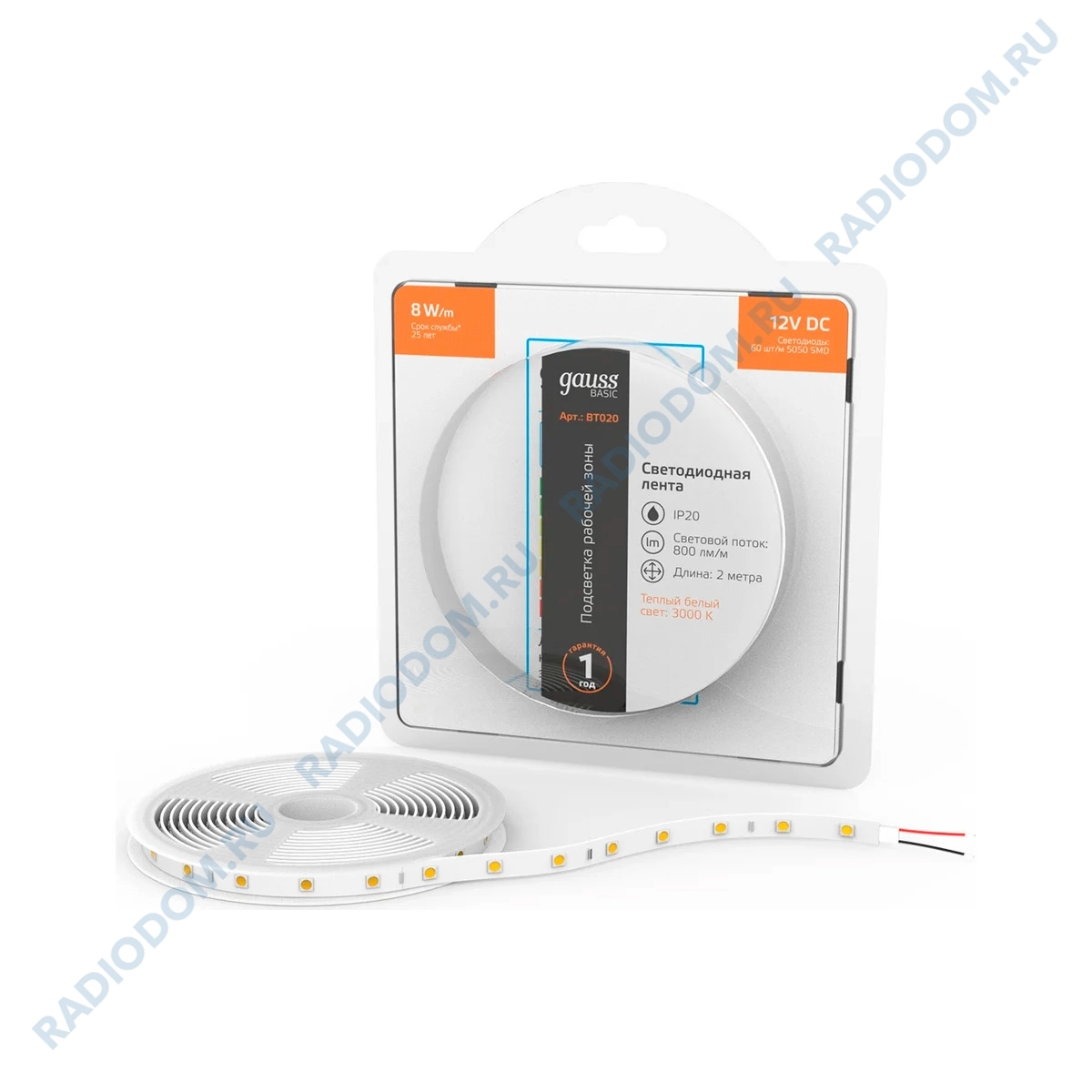 Светодиодная лента SMD5050 12В 2м белый теплый IP20 gauss