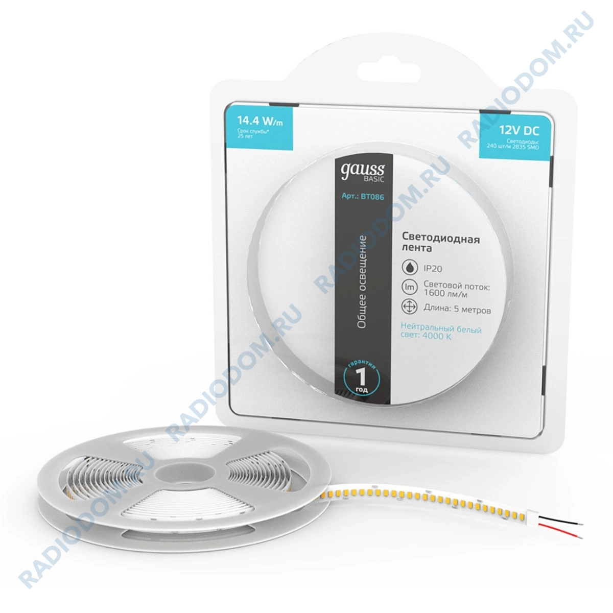 Светодиодная лента SMD2835 12В 19,2Вт белый IP20 gauss