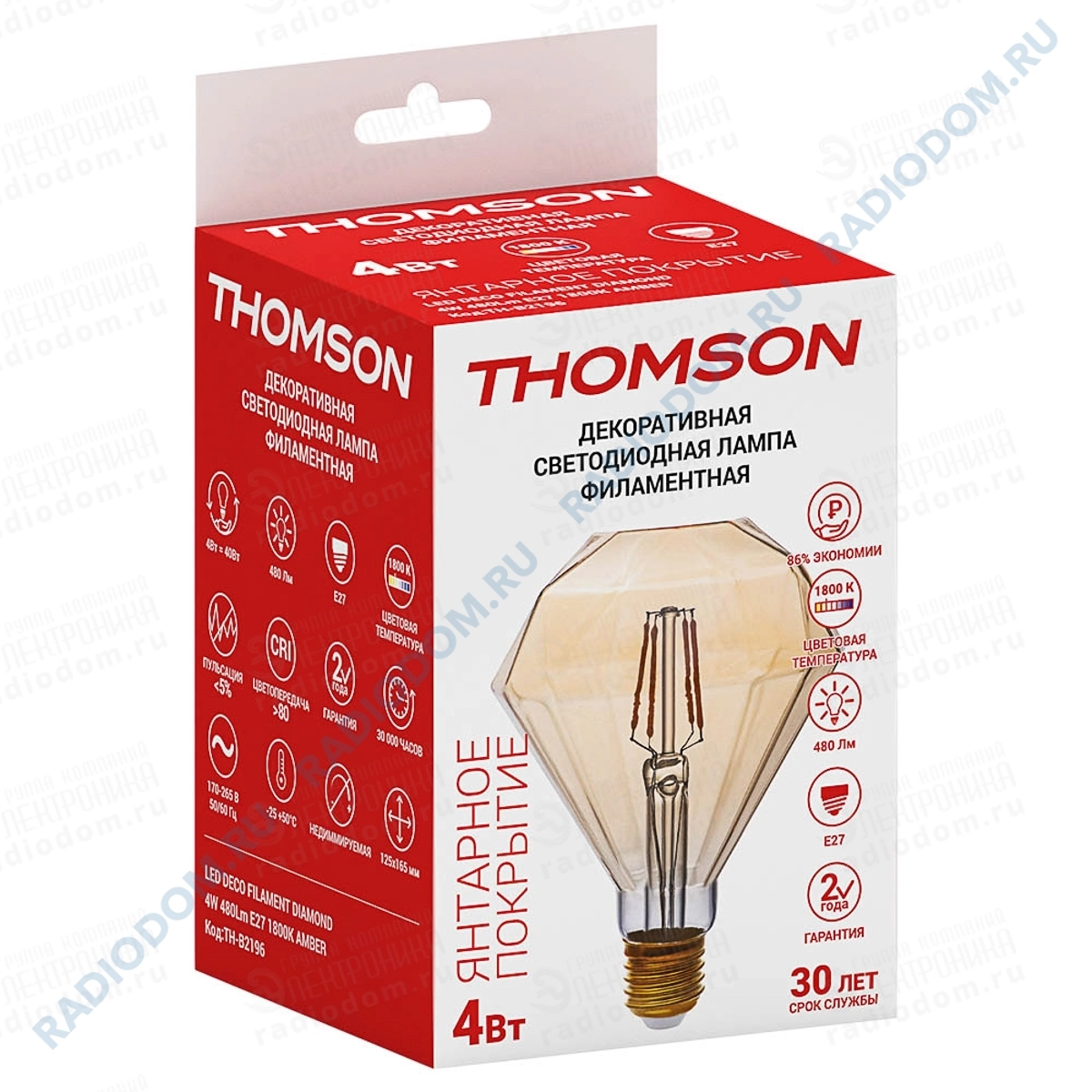 Модель серии DECO Filament THOMSON выполненная в прозрачном с медным оттенком стекле фигурной формы «Бриллиант» оснащена нитевым излучателем, имитирующим лампу накаливания, идеально подойдет для декорирования вашего интерьера, подчеркивая светильник не только качественным светом, но и лаконичным винтажным видом лампы накаливания.