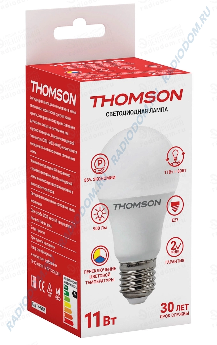 Лампа светодиодная (LED) груша 11Вт 220В Е27 3000/6500/4000К 900Лм THOMSON