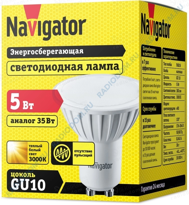 Лампа светодиодная (LED) рефлектор MR16 5Вт 220В GU10 3000К 380Лм 94264 Navigator