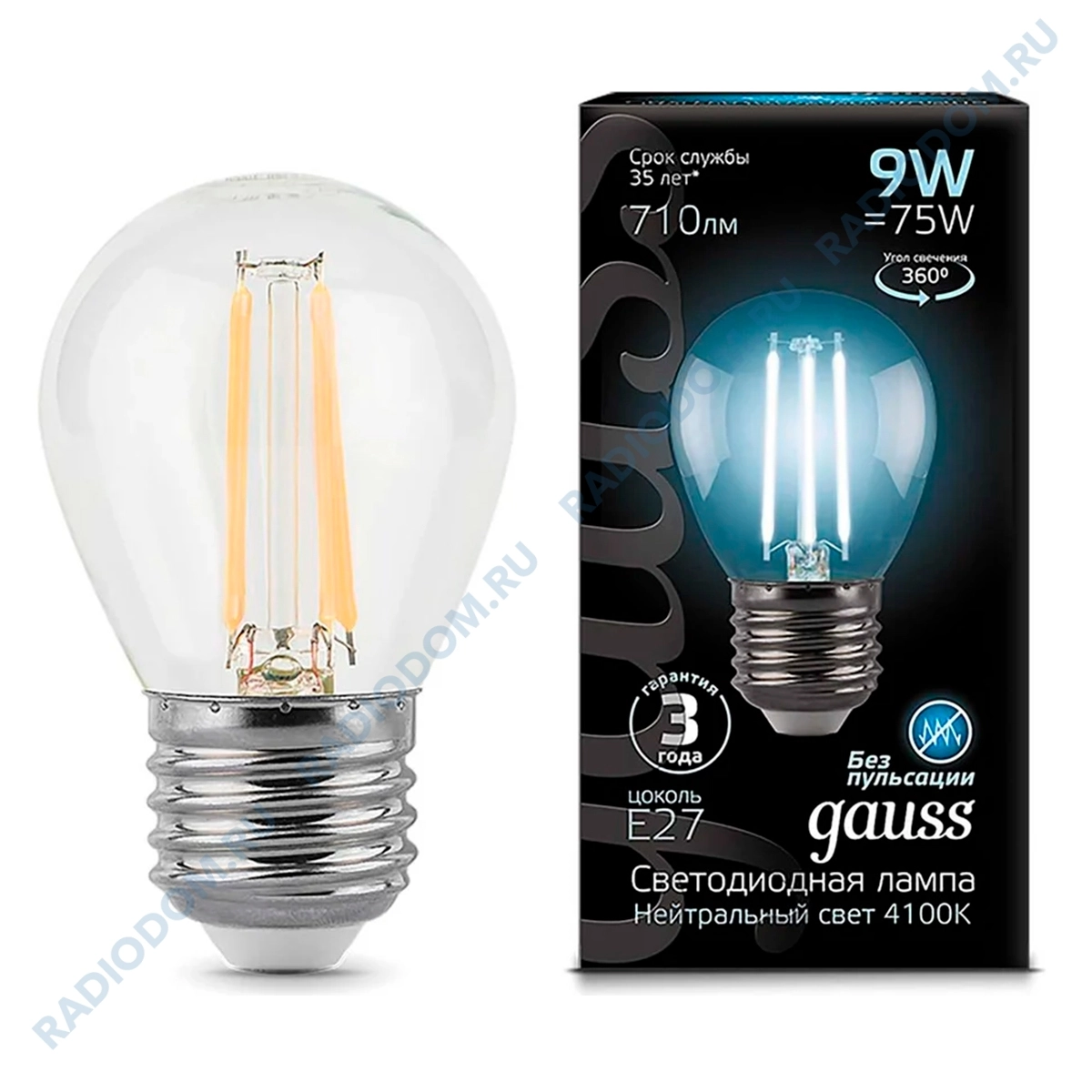 Лампа светодиодная филаментная (LED) шар 9Вт 220В E27 4100К 710Лм 105802209 gauss