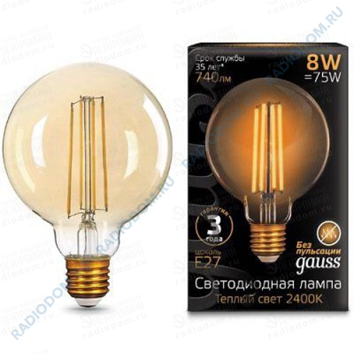 Лампа светодиодная филаментая (LED) шар 8Вт 220В E27 2400K 740Лм 105802008 gauss