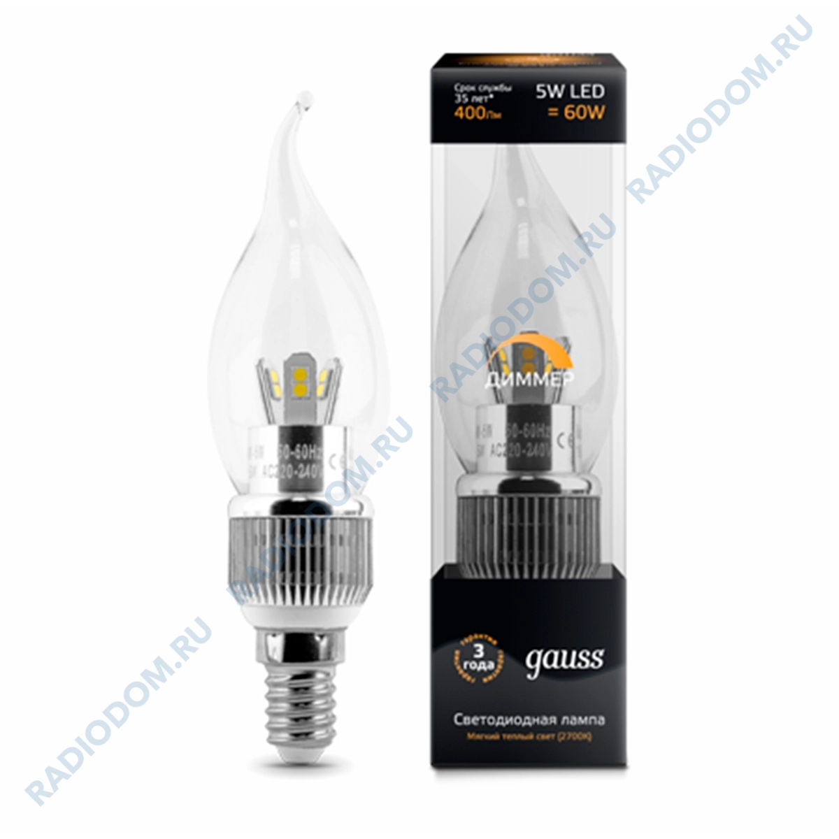 Лампа светодиодная 220В E14 5,0Вт, свет белый 4100K прозрачная Candle Tailed Crystal Clear диммируемая gauss 104201205-D