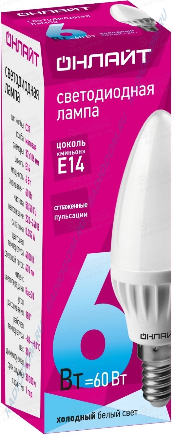Лампа светодиодная (LED) грушевидная А60 6Вт 220В Е14 4000К 470Лм Онлайт