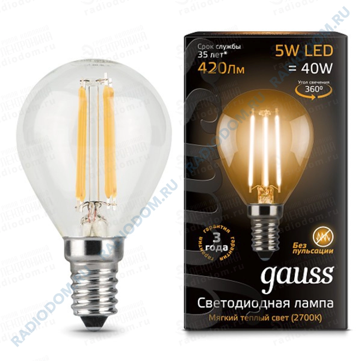 Нить со светодиодами заменила вольфрамовую, повышая долговечность данной модели в десятки раз и обладает углом освещения 360 градусов.