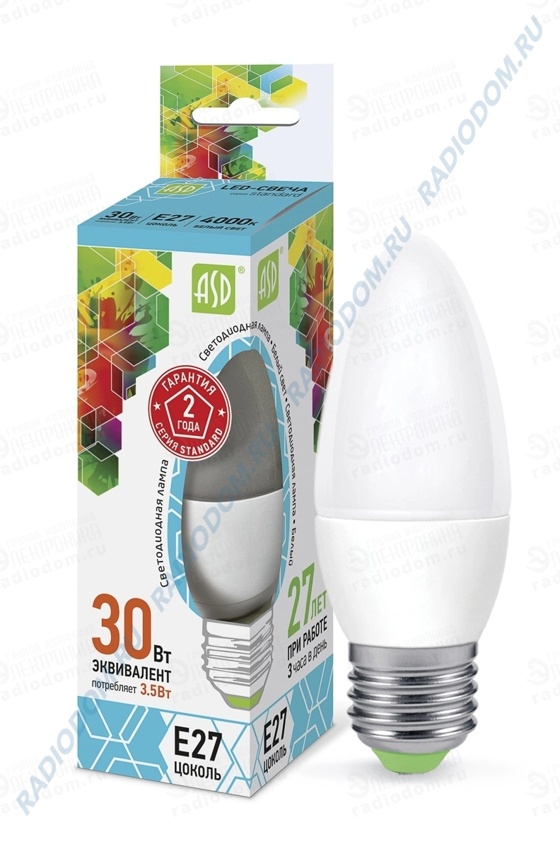 Лампа светодиодная 220В, E27, 3,5Вт, свет белый LED-СВЕЧА-standard 4000K ASD