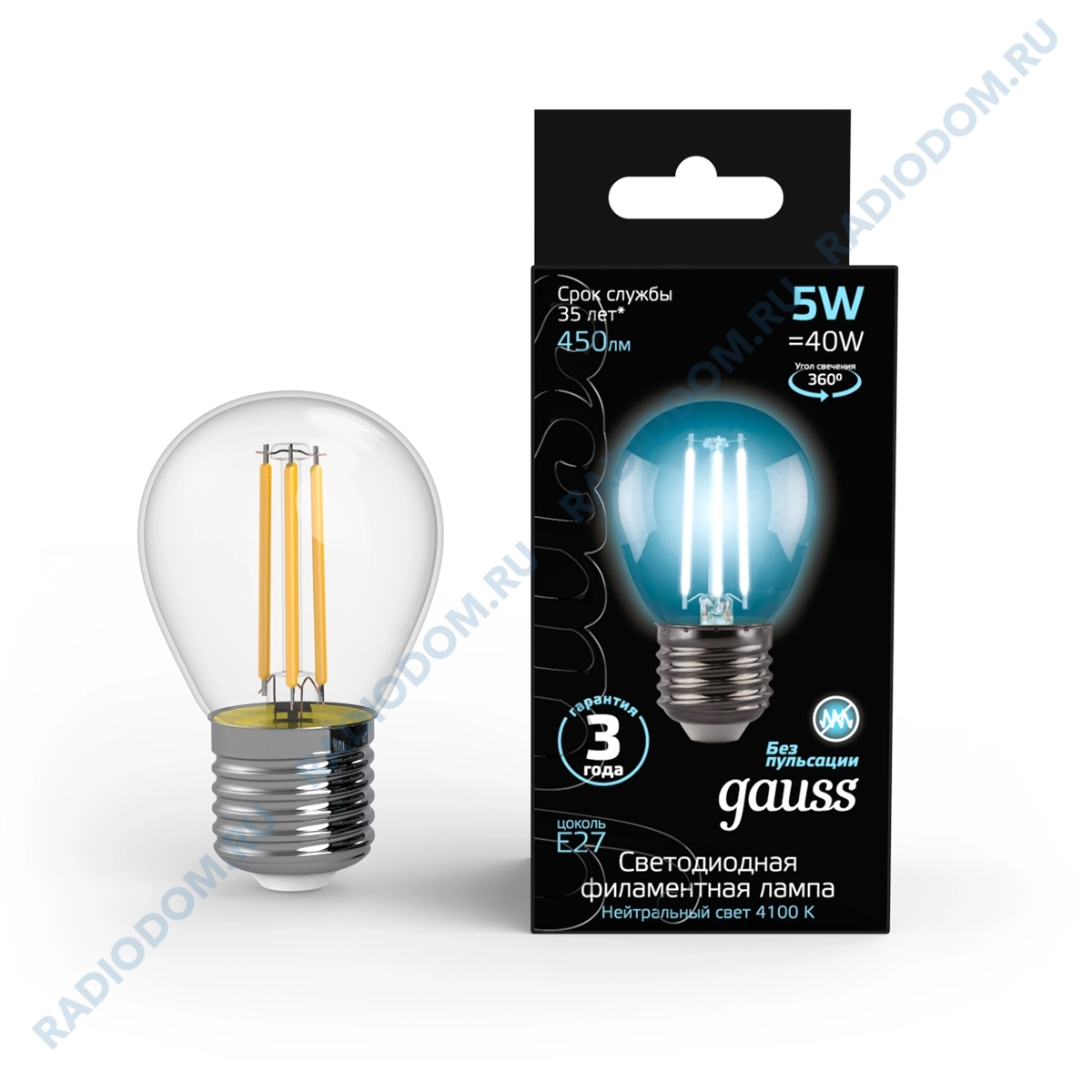 Нить со светодиодами заменила вольфрамовую, повышая долговечность данной модели в десятки раз и обладает углом освещения 360 градусов.