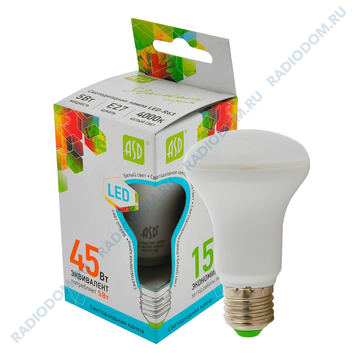 Лампа светодиодная 220В, E27, 5,0Вт, свет белый LED-R63-standard 4000K ASD