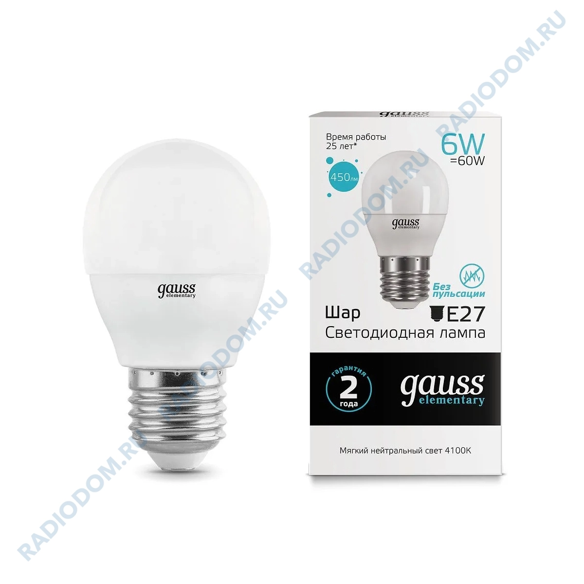 Лампа серии Elementary светит на 60 Вт, потребляя при этом всего 6 Вт. Температура свечения в 4100 К – будет комфортной, так как приближена к естественному освещению. Благодаря форме белого матового шара угол освещения 240˚. Световой поток – 450 Лм. Индекс передачи света – 80. Так как колба сделана из пластика она не разобьется при падении с высоты. Стандартный цоколь Е27, форма колбы – шар. Заявленный производителем срок службы 25 тыс. часов.